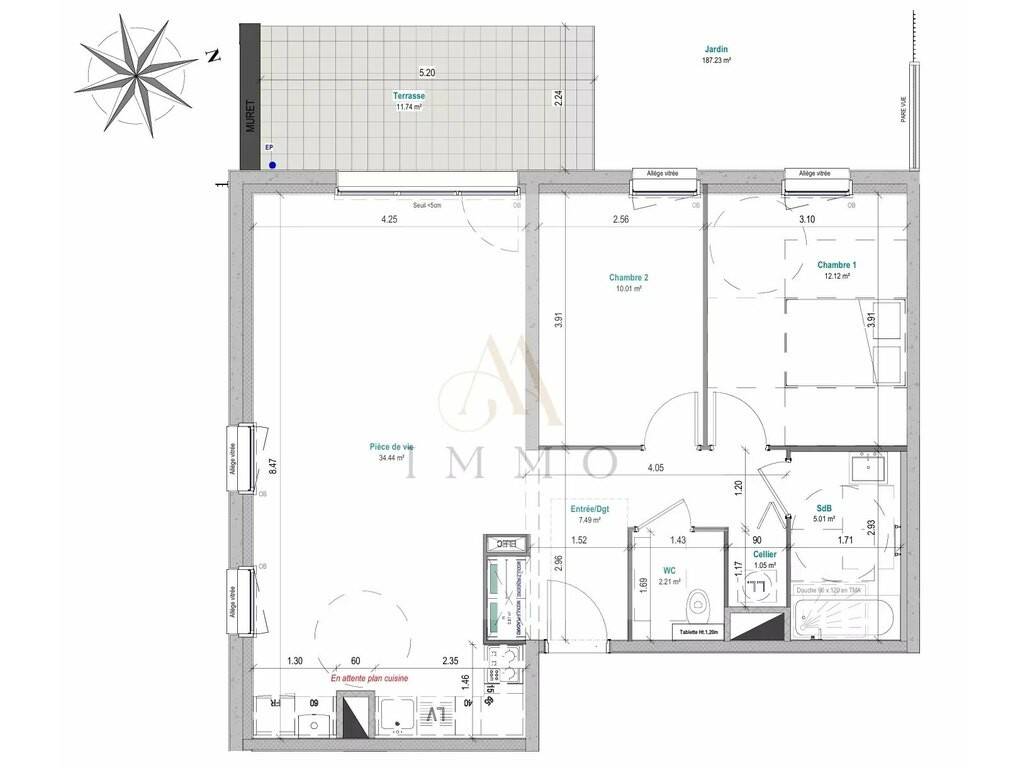 Hall d’entrée d’une surface de 7.49 m2, un WC séparé de 2.21 m2, une salle de bain d’une surface de 5.01 m2, 2 chambres à coucher : surfaces de 12.12 & 10.01 m2, un séjour d’une surface de 34.44 m2 avec accès à la terrasse de 11.74 m2, espace cuisine ouverte sur le séjour, un espace cellier d’une surface de 1.05 m2.