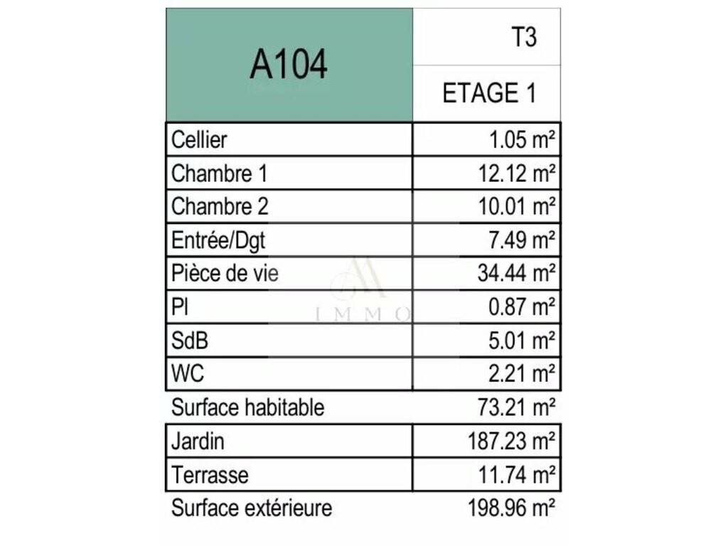 Situé au 1ER étage de la Résidence AMBRE - Appartement N° A 104 de Type T3, d’une surface habitable de 73.21 m2 + une terrasse de 11.74 m2 et un jardin de 187.23 m2, affiché au prix de 290 593€ TTC (20%)