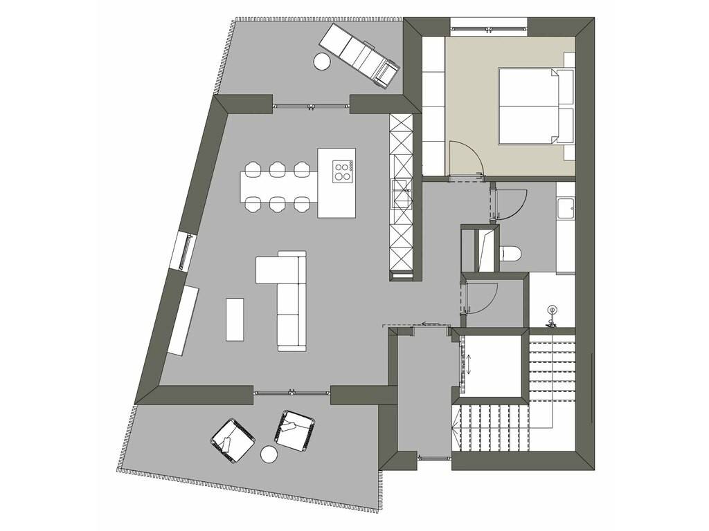 Un débarras, une salle de douche et une chambre à coucher complètent cet appartement.