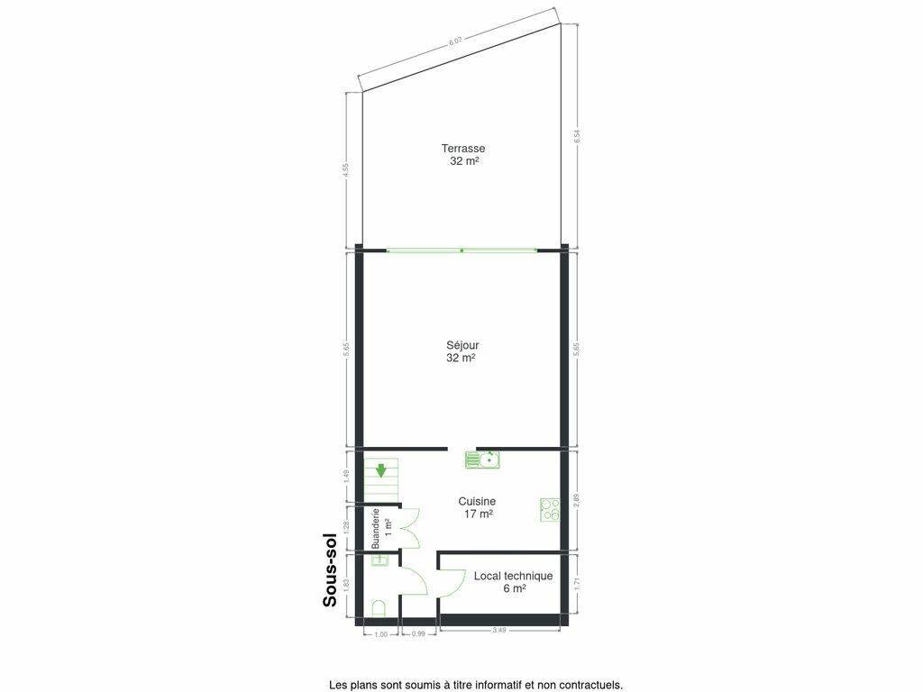 Une cuisine ouverte sur le salon et la salle à manger, donnant accès à la terrasse et au jardinet, une toilette séparée et une buanderie.