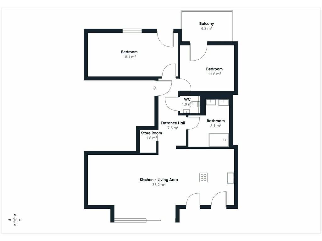 Layout: entrance hall (7,5 m²) leading to all rooms in the flat - large living room with lounge/dining area and fitted kitchen (38,2 m²) - 2 bedrooms (18,1 m² and 11,6 m²), one with access to the balcony - shower room with double sink (8,1 m²) - separated WC (1,9 m²) - storage room (1,6 m²)