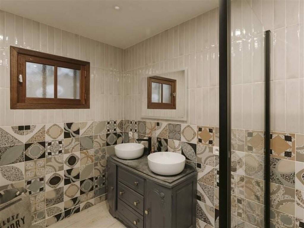 À l'étage, 4 chambres allant de 14m² à 17m², proposant de généreux espaces, parfaits pour accueillir enfants, invités ou bureau. La salle-de-bain, ornée de jolis carreaux à motifs, est pleine de caractère et comprend une douche, double évier et un WC.