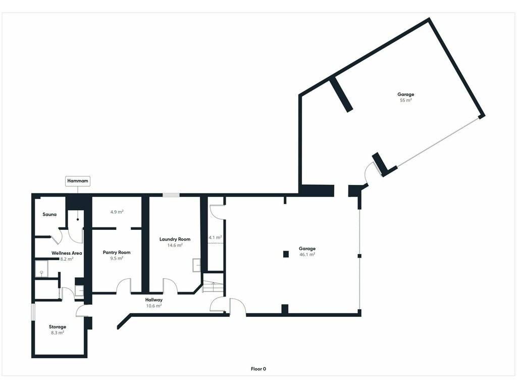 Basement: hallway – utility room (4.1 sqm) – 4 indoor parking spaces (101 sqm) with EV charger – laundry room (14.6 sqm) – pantry room (14.4 sqm) – storage (8.3 sqm) – wellness area with shower room (16.5 sqm)