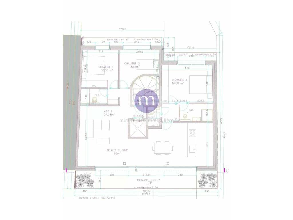 Appartement/penthouse sis au 4ème et dernier étage de 97,38 m2 avec une surface terrasse de 26,56 m2 et comprenant: living avec cuisine ouverte donnant sur terrasse, 3 chambres à coucher , 2 salles de douche, WC séparé, hall d'entrée, cave privative 9,35 m2 et un emplacement de parking intérieur automatique (parklift), buanderie commune et local vélos.