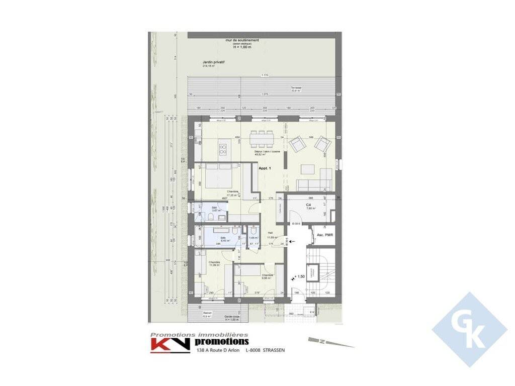 - Rez-de-chaussée : appartement 3 chambres – 132,84 m² - avec jardin privatif de 214 m²