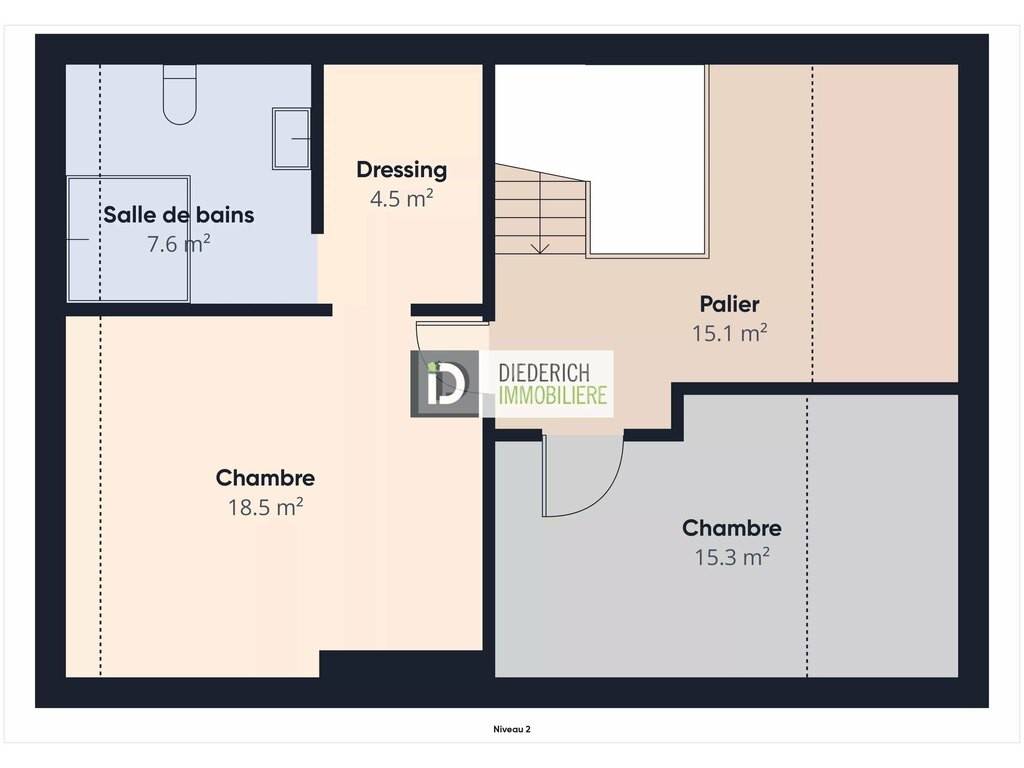 Le deuxième étage, entièrement aménagé, accueille deux chambres supplémentaires de 15,3 m² et 18,5 m².