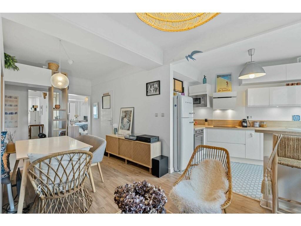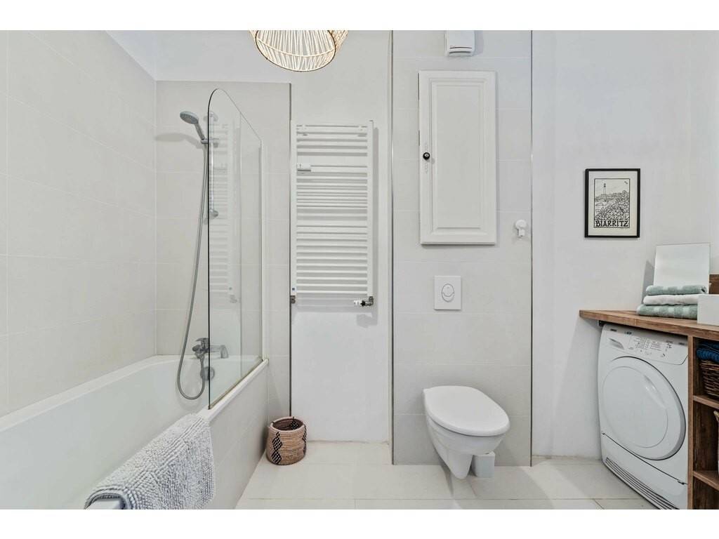The night area features two well-sized bedrooms, one of which has a dressing area separated by a lovely glass wall. An elegant bathroom with a bathtub, sink, suspended toilet, and an integrated laundry space adds to the comfort of this apartment. Two cellars and an attic pleasantly complete it, providing additional storage capacity of nearly 12 m2.