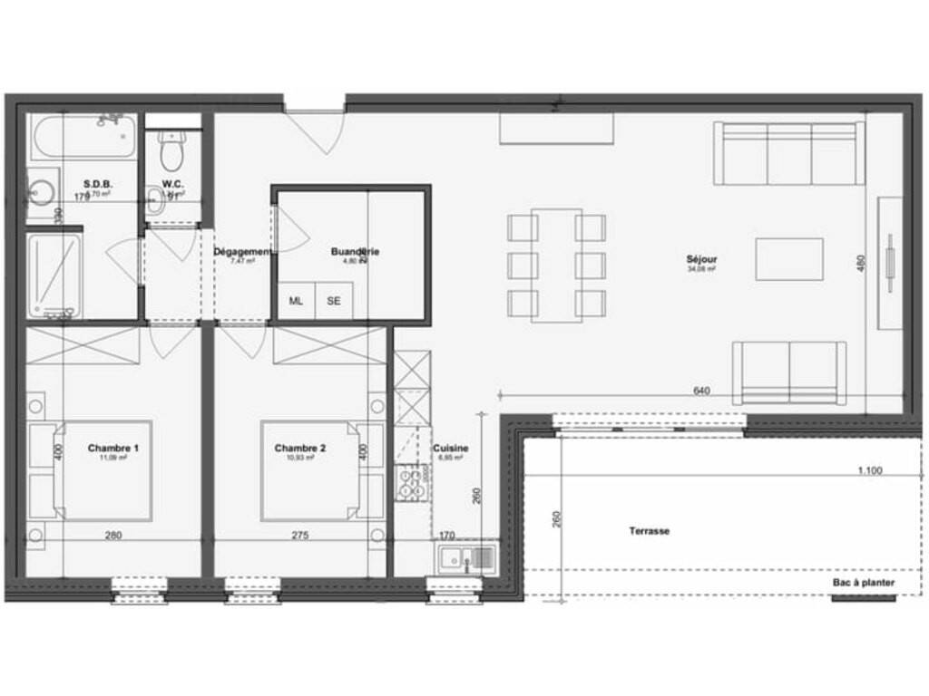 Celui-ci se compose d’un hall d’entrée, d’un wc, d’un séjour de +/- 34 m² ouvert sur un espace cuisine de +/- 7 m², de 2 chambres de +/- 11 m², d’une salle de bain de +/- 6 m² et d’une buanderie de +/- 5 m².