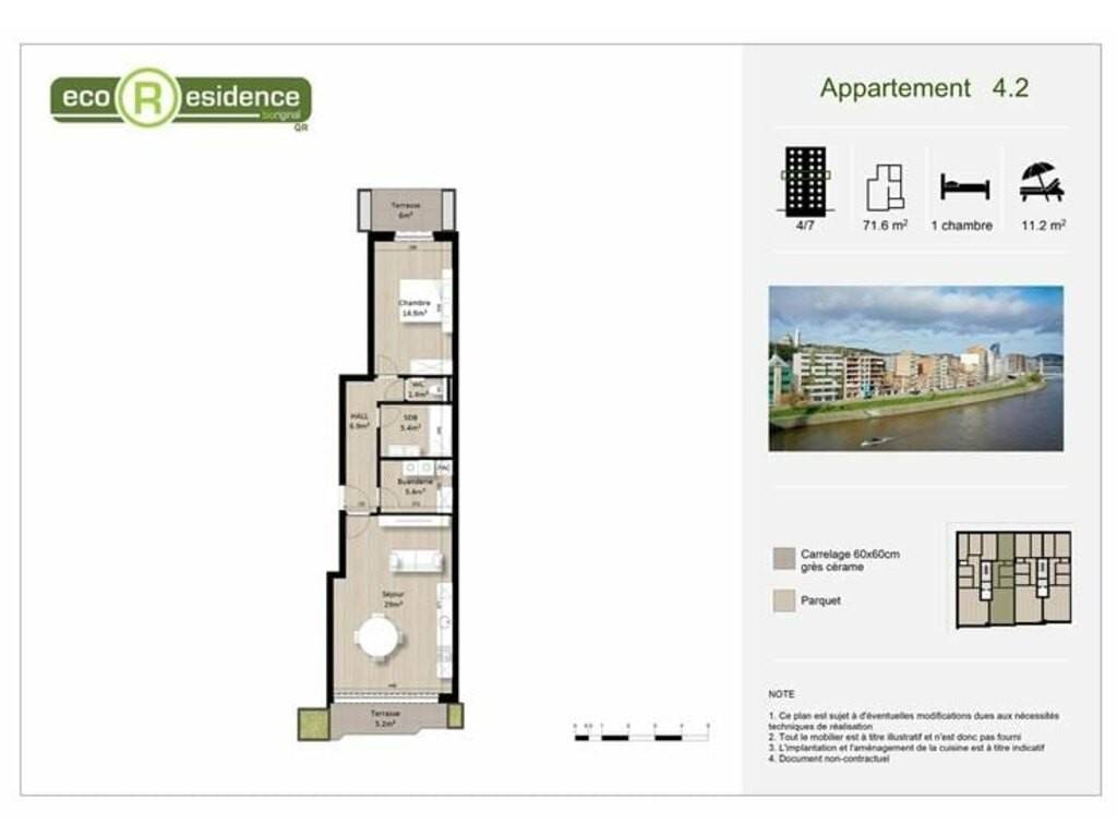 Composition : séjour 29 m² avec vue Meuse, grande chambre 15 m², buanderie, salle de douche, WC séparé, terrasse 11 m².