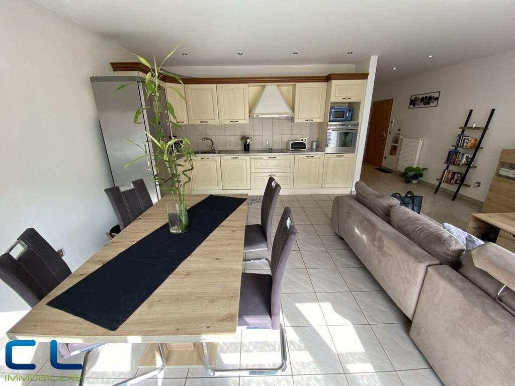 L'appartement de 71 m2, + une terrasse orienté sud, très lumineux et très bien agencée, se compose comme suit: - un grand hall d'entrée - une cuisine équipée ouverte sur le salon et avec un grand balcon orienté sud, - deux chambres à coucher, d'une salle de douche et d'un débarras. Une cave et un garage fermé font également partie de ce lot.