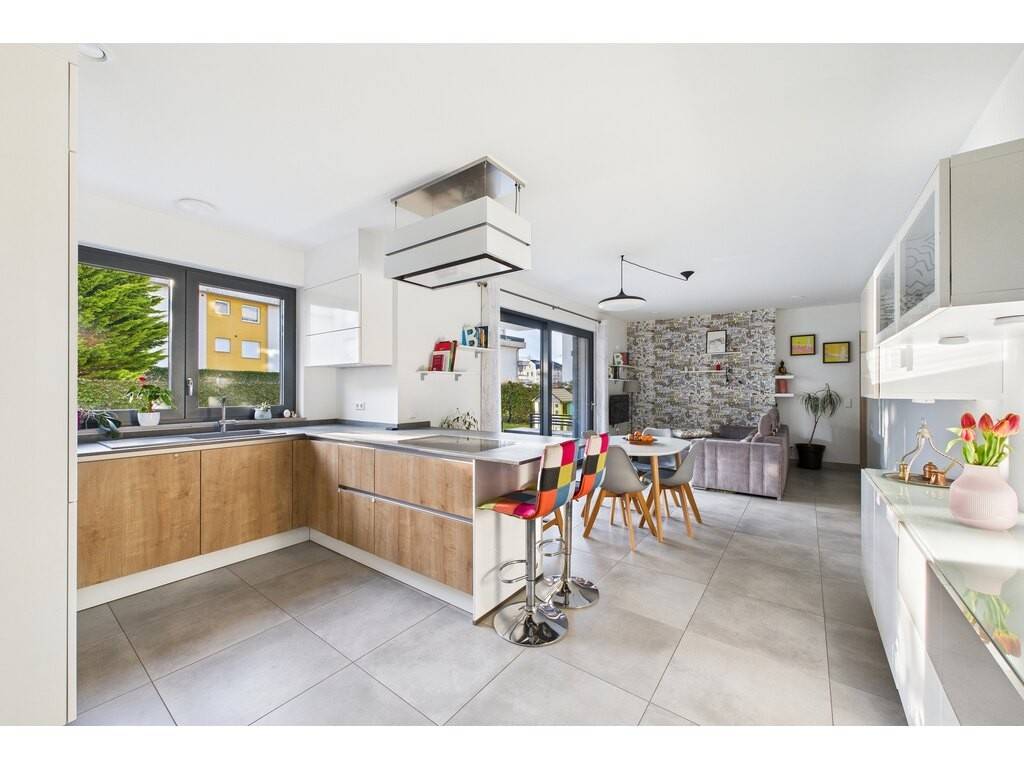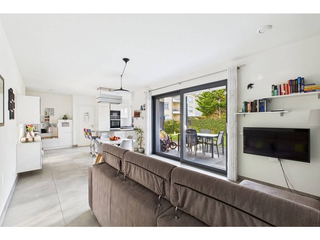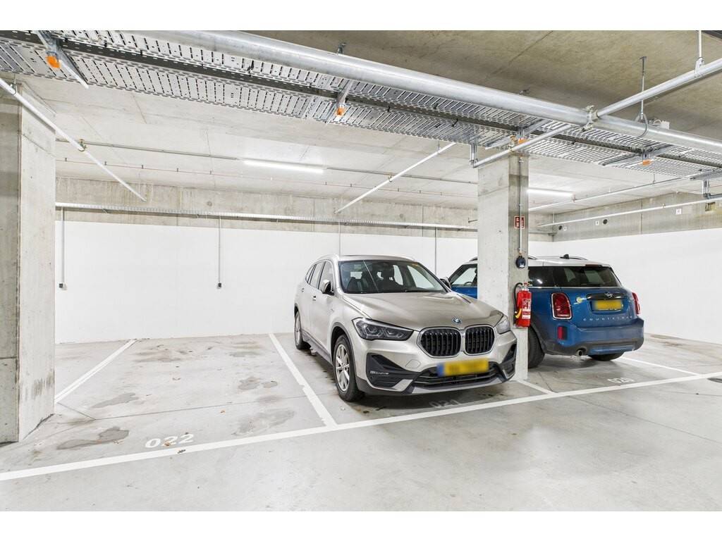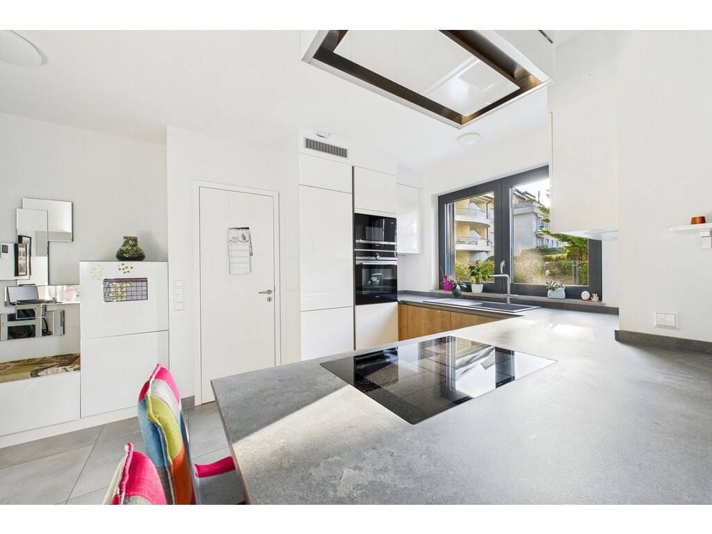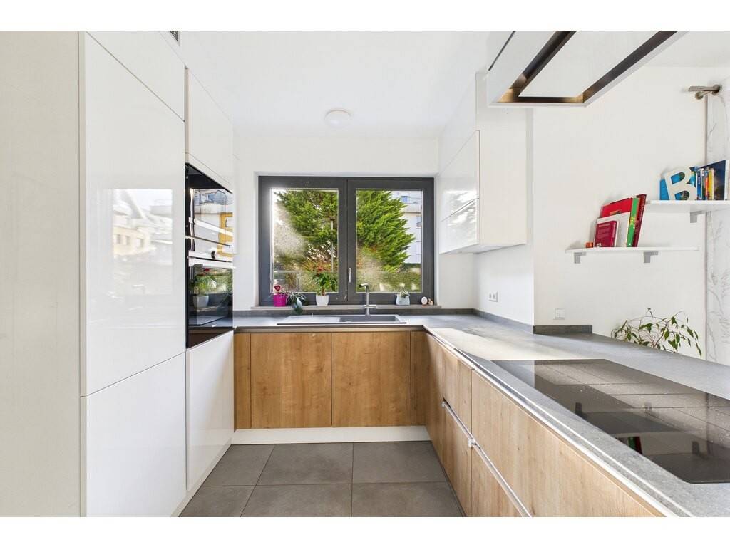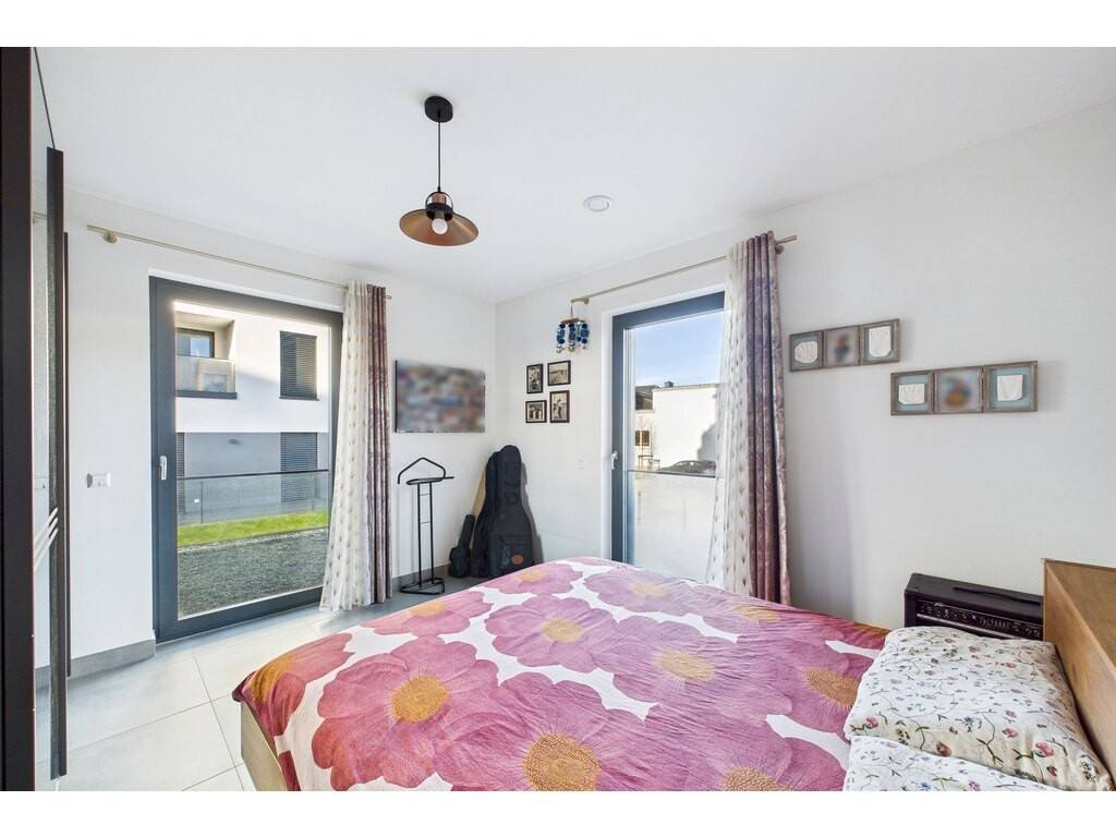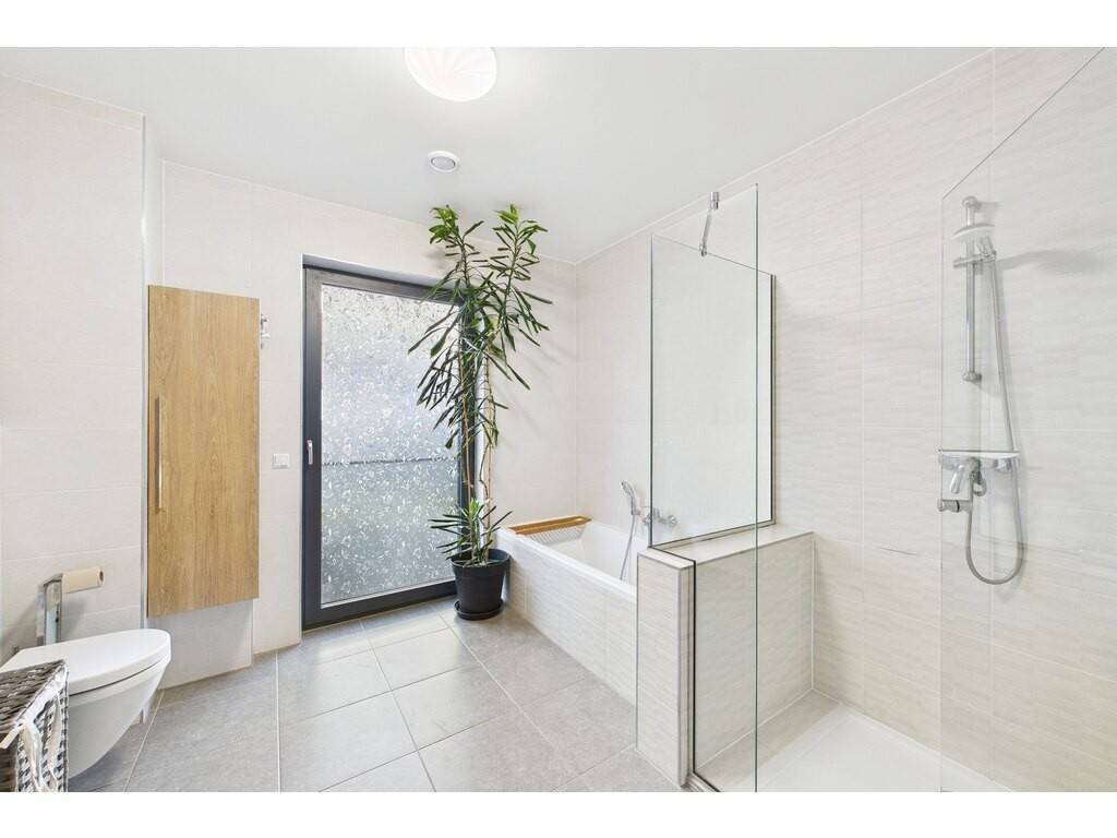 En détails: - Living ouvert sur la cuisine de ± 38 m² avec accès grâce à une grande baie vitrée sur la terrasse et le jardin - Cuisine entièrement équipée haut de gamme avec hotte ascensionnelle - Grand débarras accolé à la cuisine disposant des raccords pour machine à laver et sèche linge et la VMC individuelle - 2 grandes chambres à coucher de 15,2 m² et 15,8 m² - 1 grande salle de bains et douche avec WC et double vasque de 9,4 m² - WC séparé - Cave de ± 5,6 m² - 1 emplacement intérieur - 1 buanderie commune (mais les machines à laver sont dans l'appartement) - 1 immense local vélo bien organisé (voir photo)