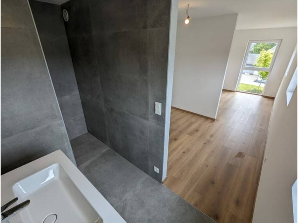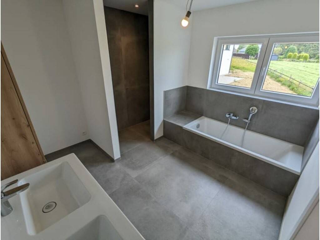 Les finitions intérieures témoignent d’une attention particulière portée aux détails : murs et plafonds enduits, peinture blanche, et un carrelage haut de gamme en grands formats rectifiés 1m x 1m couvrant le rez-de-chaussée et la salle de bain. À l’étage, les chambres, le dressing et le hall sont réchauffés par un parquet élégant.