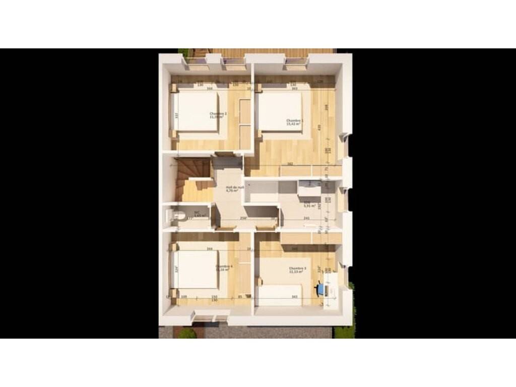 À l’étage : • Hall de nuit • 4 chambres • 1 salle de bain complète avec douche, baignoire, WC et lavabo