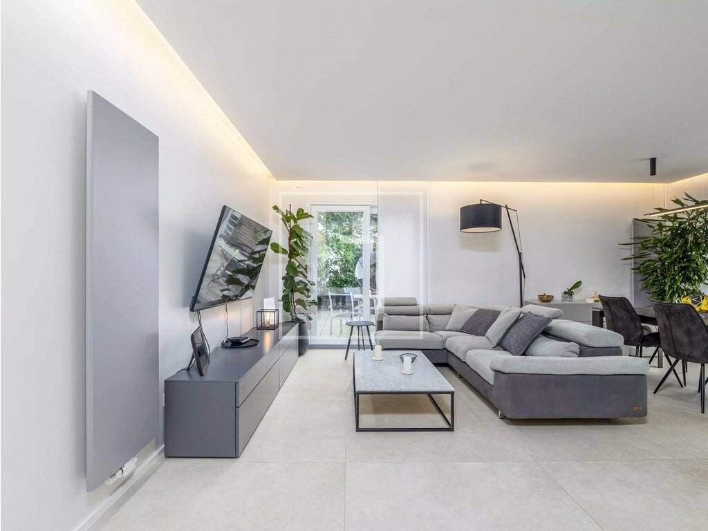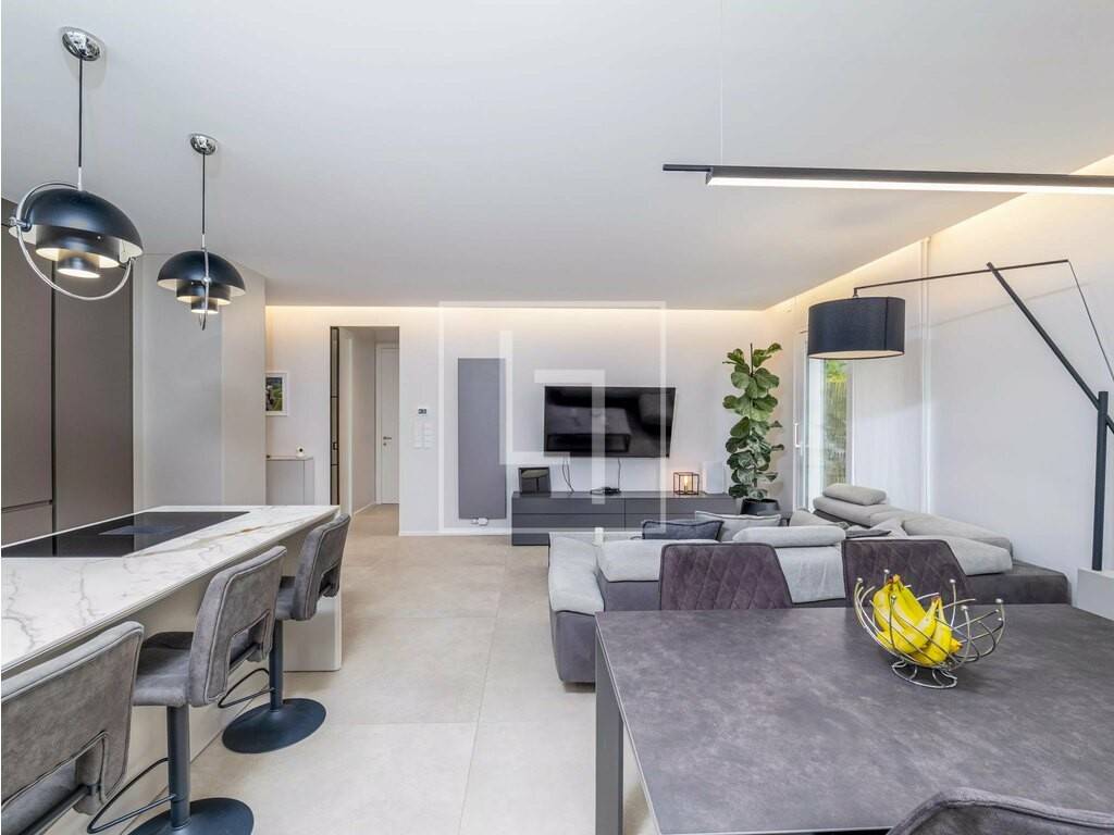 - une entrée avec placards intégrés, - un vaste salon-séjour ouvert sur une cuisine haut de gamme équipée d'électroménager SMEG, - De grandes baies vitrées donnant accès direct à la terrasse