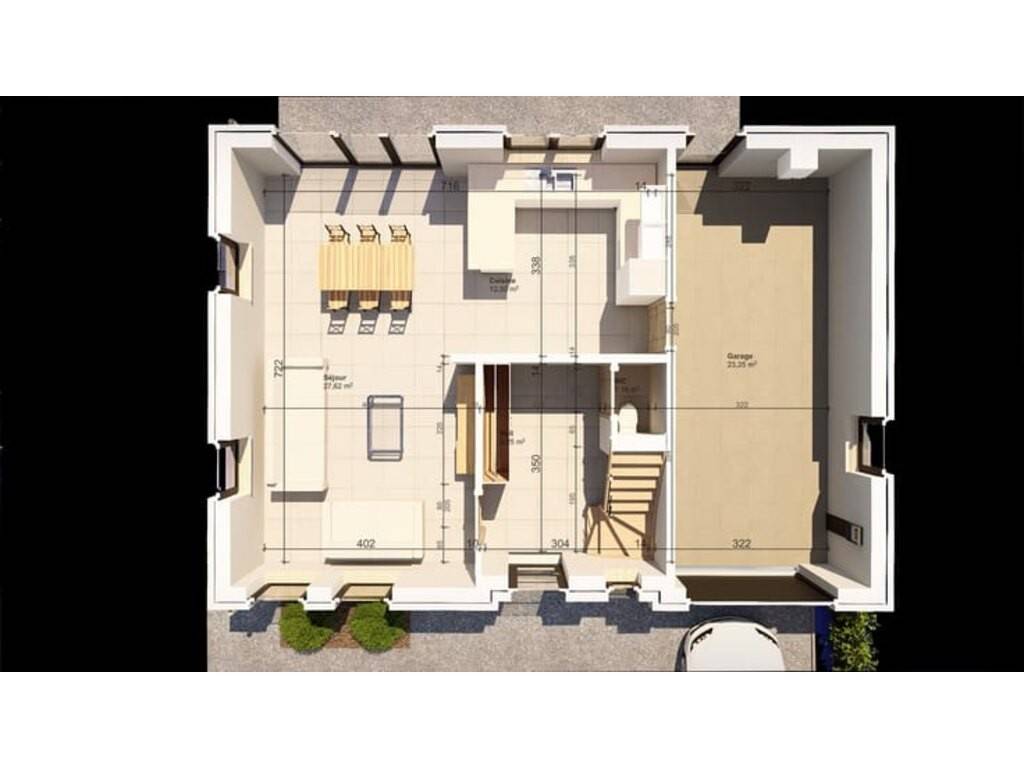 Au rez-de-chaussée : • Hall d’entrée avec WC indépendant • Séjour lumineux ouvert sur la cuisine • Cuisine • Garage / Buanderie • Terrasse • Jardin