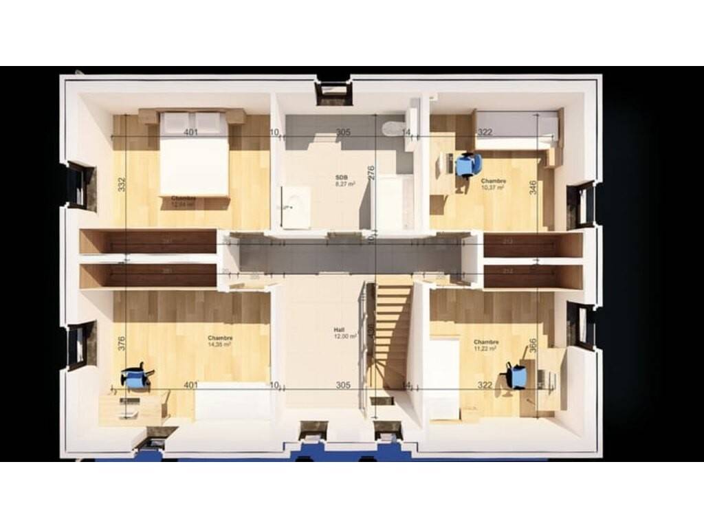 À l’étage : • Hall de nuit • 4 chambres • 1 salle d'eau avec douche, WC et lavabo