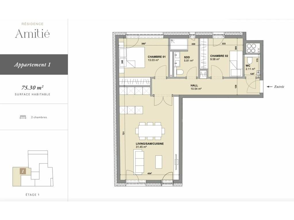 Located on the 1ᵉʳ floor of a small-scale residence comprising:
