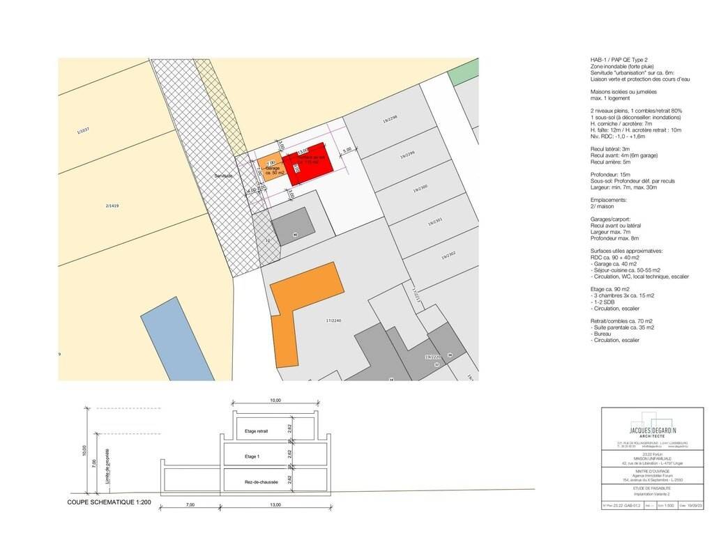 2 niveaux pleins, 1 combles/retrait 80% 1 sous-sol (à déconseiller: inondations) H. corniche / acrotère: 7m H. faîte: 12m / H. acrotère retrait : 10m Niv. RDC: -1,0 - +1,6m Recul latéral: 3m Recul avant: 4m (6m garage) Recul arrière: 5m Profondeur: 15m Sous-sol: Profondeur déf. par reculs Largeur: min. 7m, max. 30m Emplacements: 2/ maison Garages/carport: Recul avant ou latéral Largeur max. 7m Profondeur max. 8m