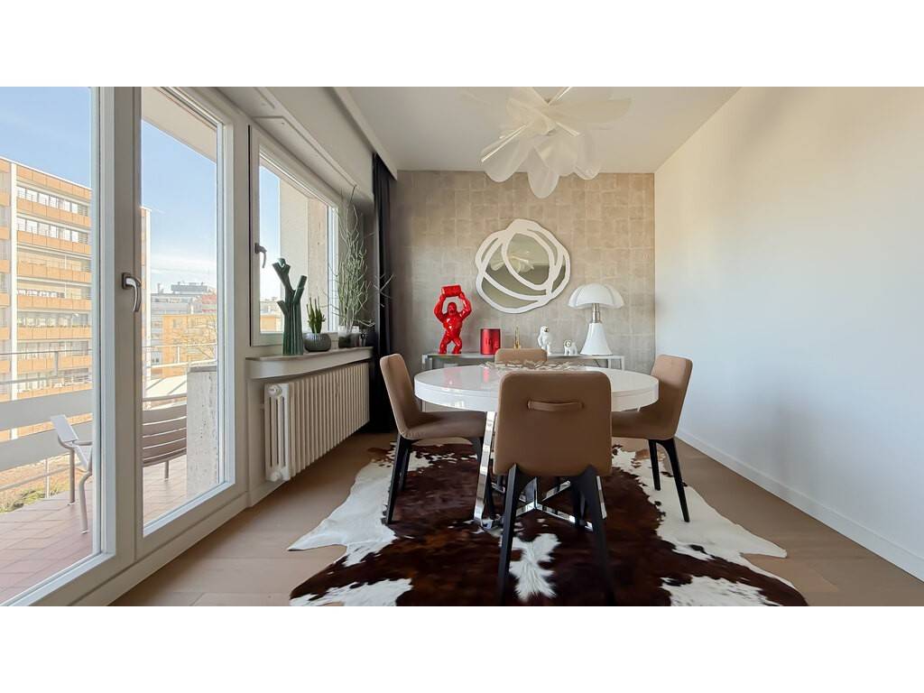 Situé au quatrième étage, il bénéficie d'une triple exposition avec de belles vues dégagées Les espaces de vie se composent d'un vaste séjour et salle à manger d'environ 40 m², d'une superbe cuisine dinatoire Poliform de plus de 20 m² baignée de lumière avec accès balcon et vue dégagée Deux grandes chambres offrent confort et calme avec la possibilité d'en aménager une troisième La salle de douche contemporaine dispose d'une élégante douche à l'italienne avec WC intégré et fenêtre, un WC séparé avec fenêtre complète l'ensemble