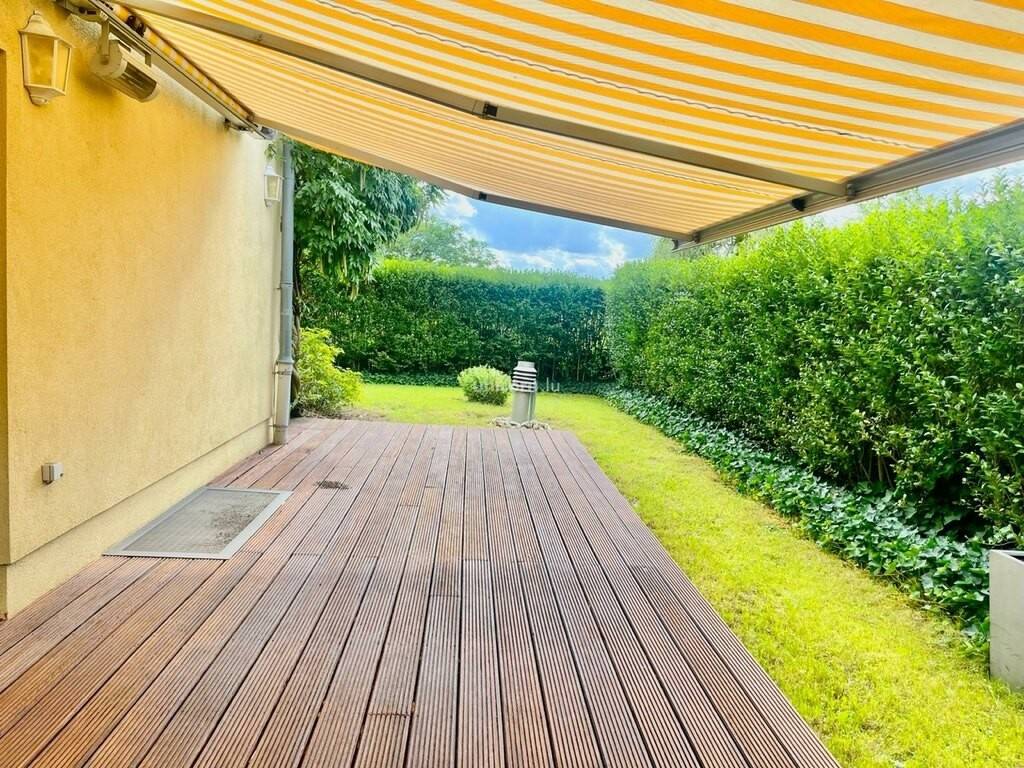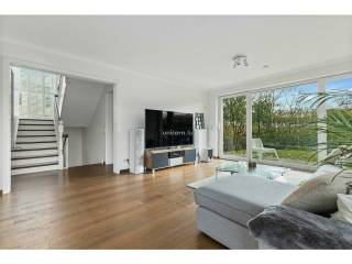 The spacious living room, bathed in light thanks to large bay windows, opens harmoniously onto a terrace of approximately 300 square feet and a private garden, ideal for enjoying sunny days in complete privacy.