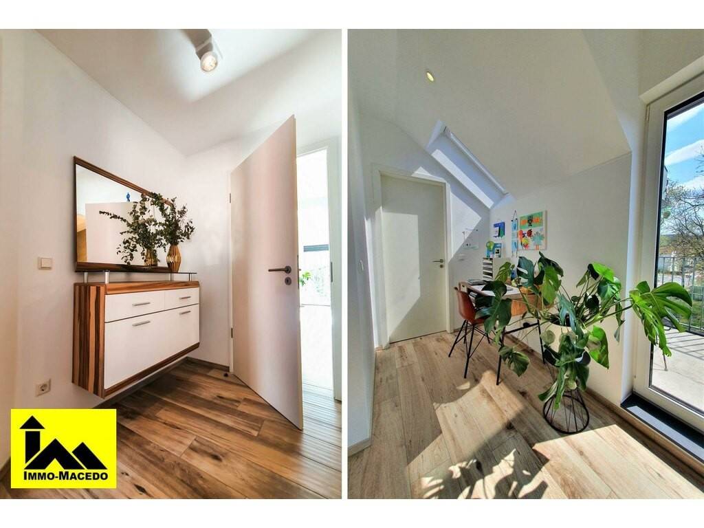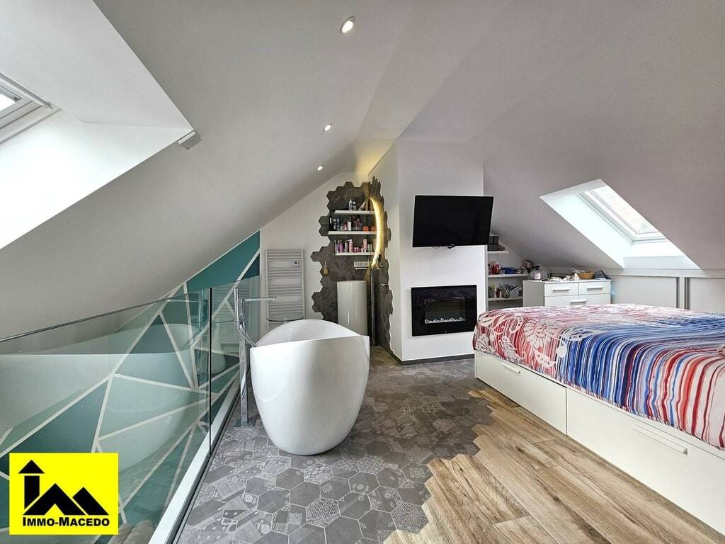 Hall de entrada, 3 a 4 quartos, cozinha aberta equipada com varanda (5,25 m2), sala de jantar/estar com saída para 2ª varanda virada a sul (5,25 m2), casa de banho italiana, arrecadação com VMC, sótão equipado com master suite com banheira/wc/lavatório/ar condicionado e espaços vazios na sala, hobby / lavandaria privativa no rés-do-chão com acesso ao terraço/jardim fechado, Garagem, Estacionamento(s) privativo + visitantes e 2º lote de jardim. Venha visitar!!