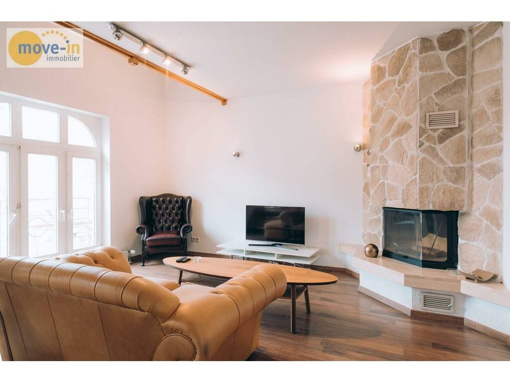 Living room with open fireplace and fitted kitchen, laundry, guest toilet and cloakroom.