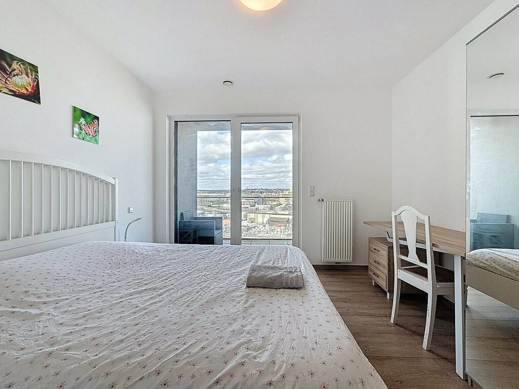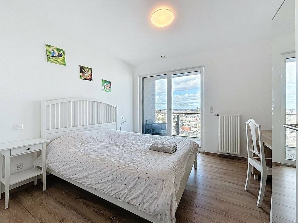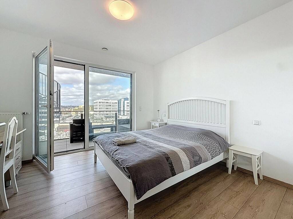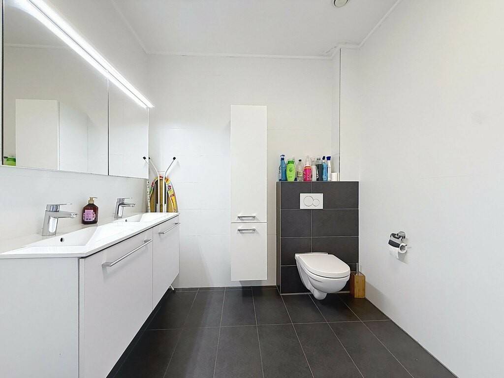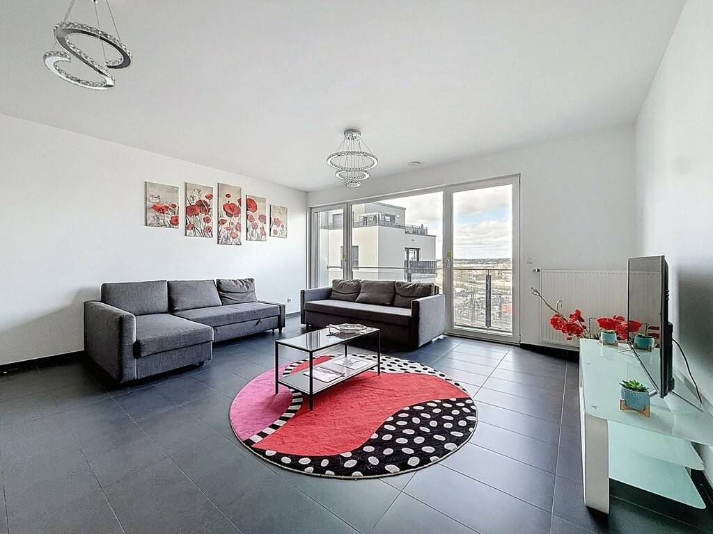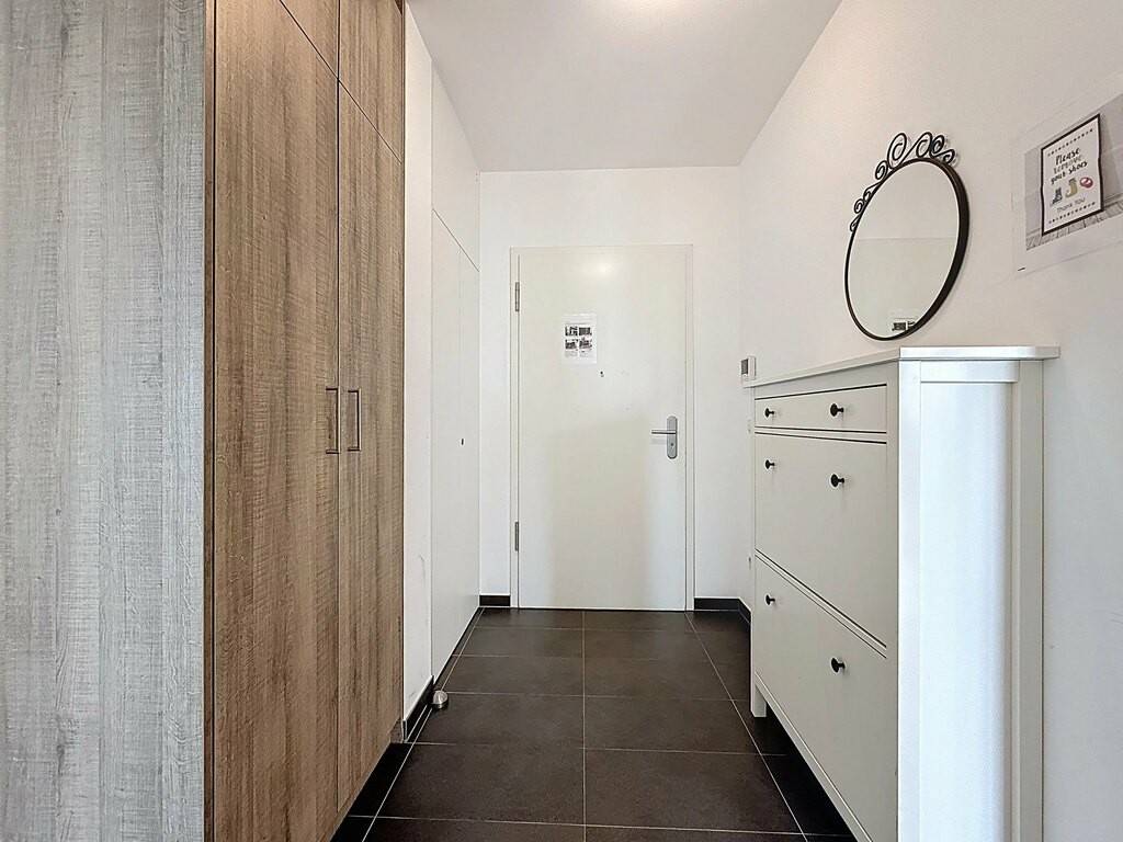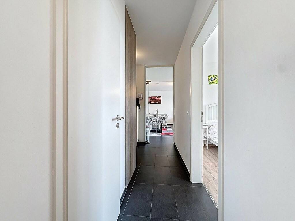 L’entrée, avec placards intégrés (± 9 m²), mène à un vaste espace de vie lumineux d’environ 39 m² comprenant un séjour, une salle à manger et une cuisine ouverte, entièrement aménagée et équipée, avec accès direct à une terrasse de ± 11 m². La partie nuit se compose de deux chambres (± 12 m² et ± 14 m²), d’une salle de bains spacieuse (± 8 m²) et d’un WC séparé (± 2 m²).