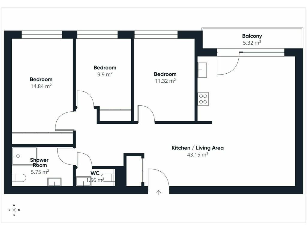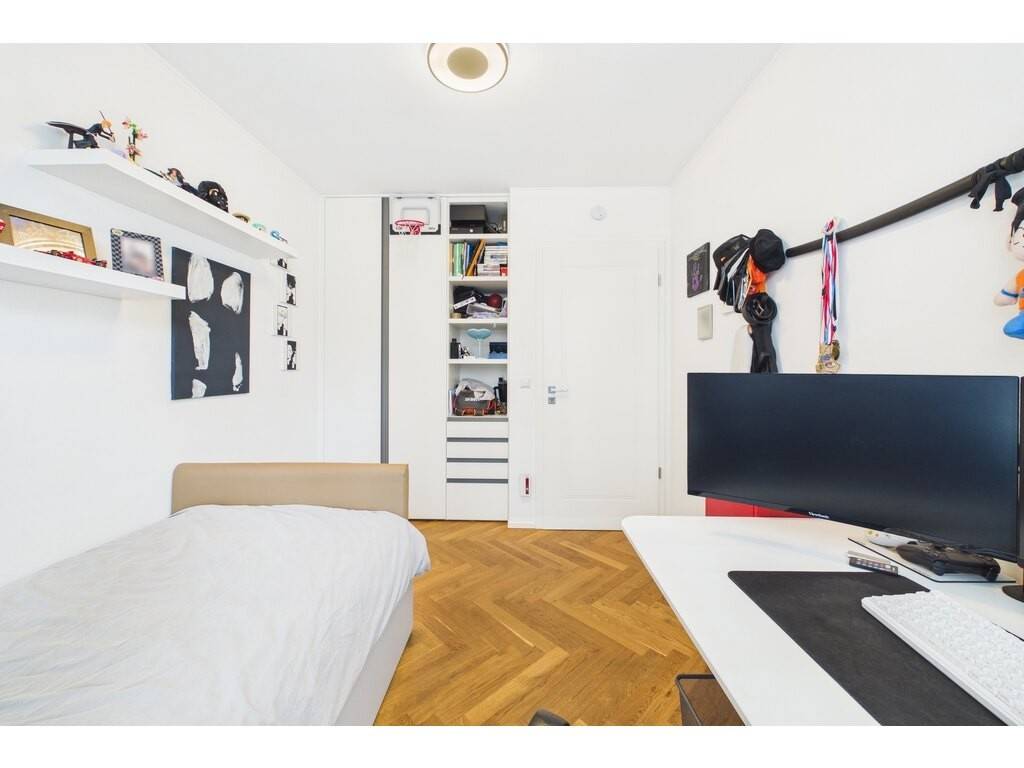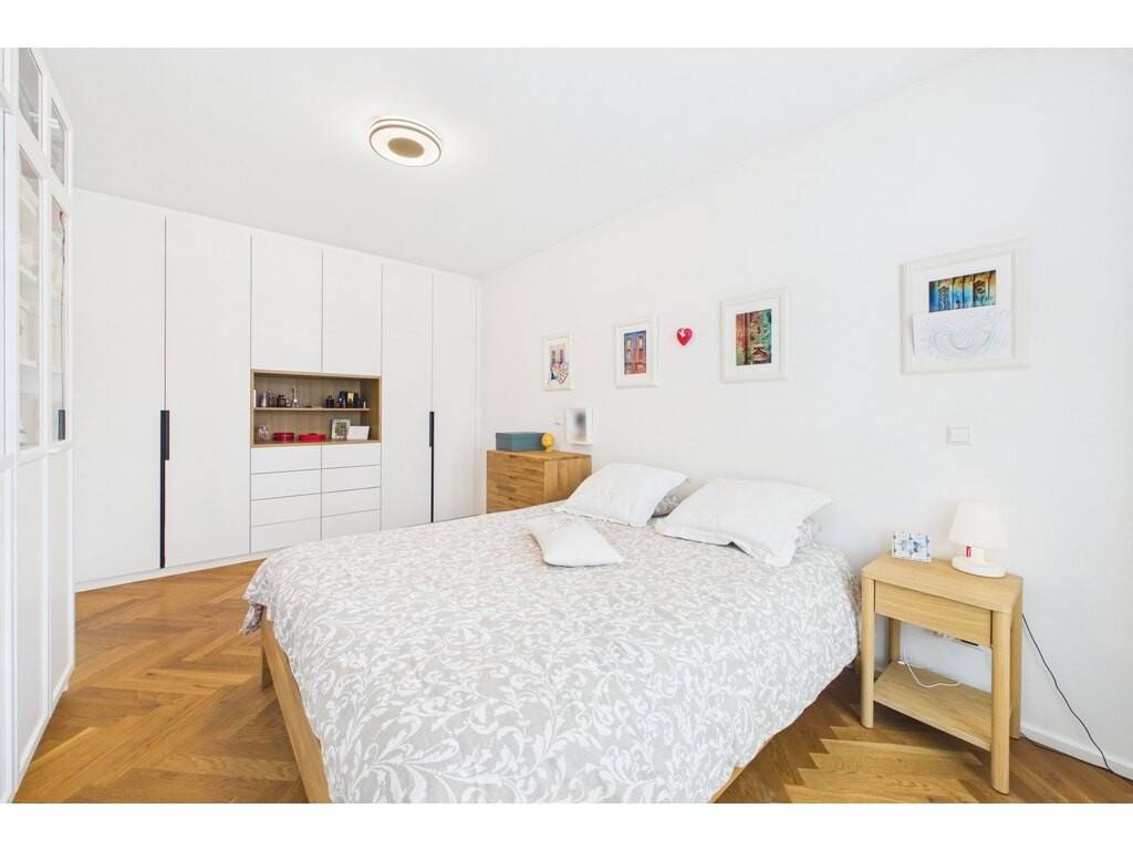 Layout: entrance hall/corridor with built-in wardrobe, leading to all rooms in the flat, including the spacious living area with fitted office corner, lounge and custom-built kitchen (43.1 sqm) - 3 bedrooms (9.9 sqm, 11.3 sqm and 14.8 sqm) with built-in wardrobes - shower room with WC (5.7 sqm) - separated WC (1.6 sqm)