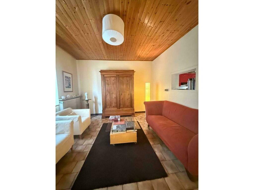 Au rez-de-chaussée, vous découvrirez un salon chaleureux au style intemporel, mettant en valeur les matériaux d'époque et une décoration soignée.