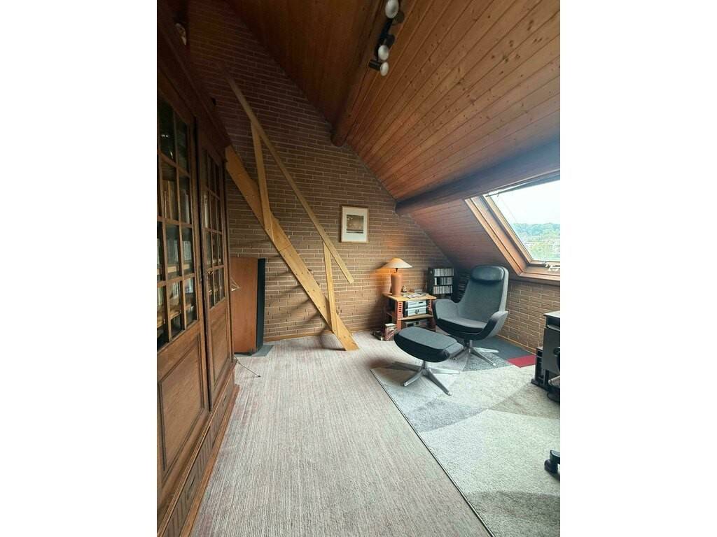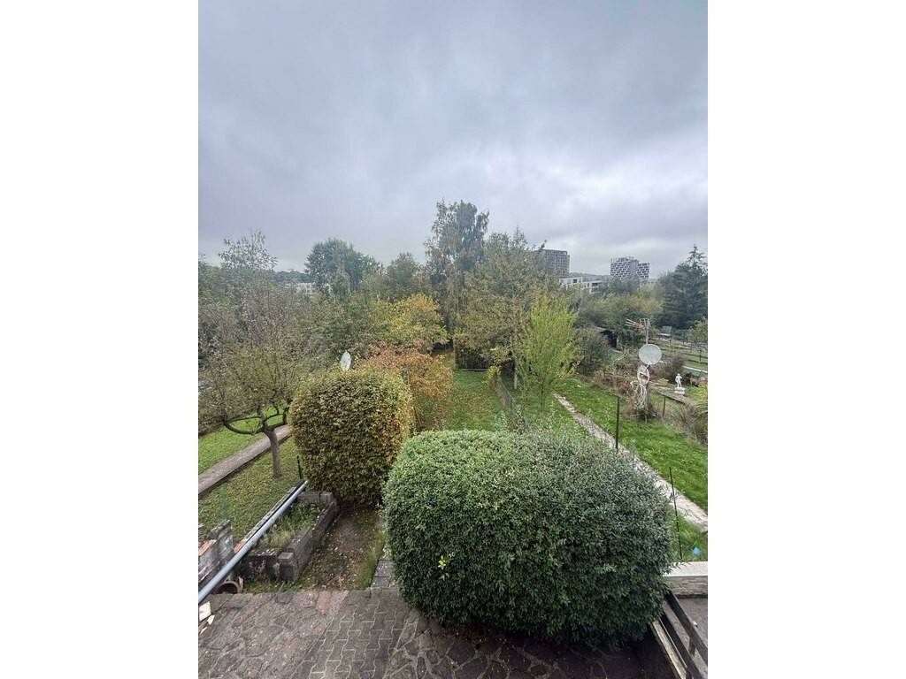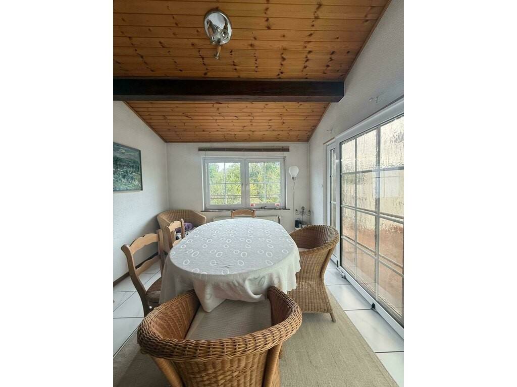 La cuisine séparée, joliment aménagée, communique avec le salon grâce à une ouverture murale qui crée un bel effet de convivialité tout en préservant la structure d'origine. Elle offre également un accès direct à la véranda, idéale comme espace détente ou salle à manger d'été, menant ensuite vers le vaste jardin arboré avec accès privé au parc de Differdange — un véritable havre de paix.