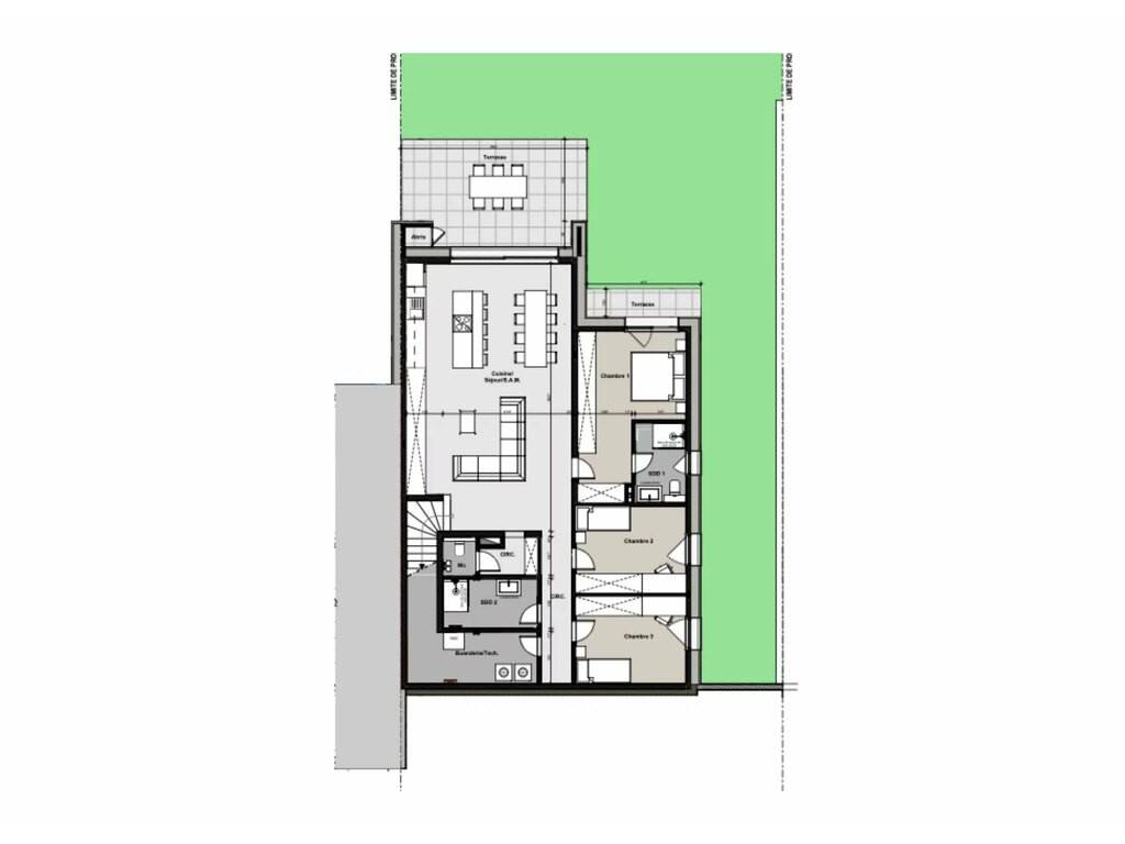 - Un hall de distribution - Un espace salon-séjour avec cuisine ouverte avec accès à la terrasse principale et au jardin - 2 chambres à coucher - Une salle de douche avec WC - Une 3ème chambre avec salle de douche privative et accès terrasse - Un local buanderie - Un local technique - Un WC séparée
