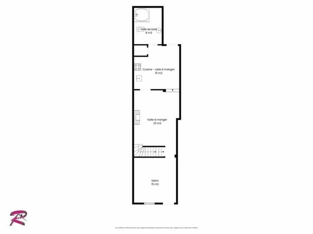 Le bien se compose comme suit : Au rez-de-chaussée : Un salon de 15m², une salle-à-manger de 21m², une cuisine équipée (14m²), une salle de bain comprenant une baignoire, un WC et un évier ;