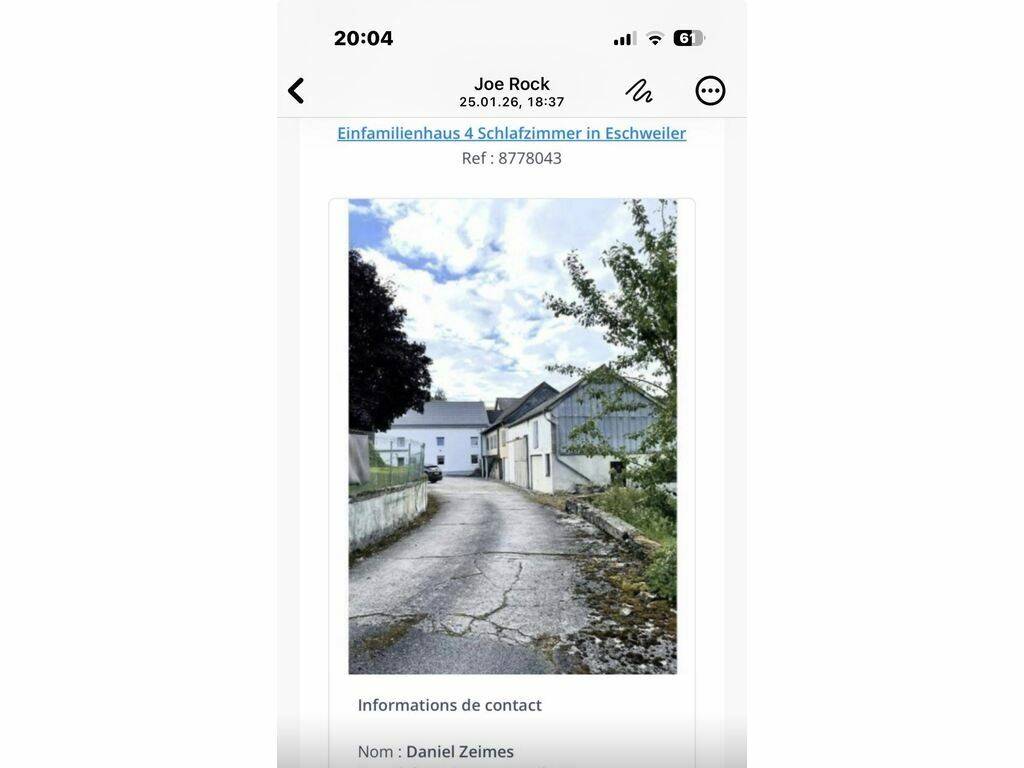 Maison individuelle à vendre à Eschweiler, Luxembourg, proposée par l'agence immobilière Joe Rock. Cette belle maison familiale est située dans un quartier charmant offrant un cadre de vie paisible, à proximité des commodités essentielles. Détails du bien : Spacieuse, cette maison de 149 m² comprend quatre chambres confortables et une salle de bains. Son garage et ses cinq places de parking extérieures constituent un atout majeur, idéal pour recevoir famille et amis. Construite avec soin, cette maison est parfaite pour une famille appréciant les grands espaces. Elle est également équipée d'un chauffage au fioul, garantissant un confort optimal durant les mois les plus froids, et bénéficie d'une classe énergétique F, témoignant d'une consommation maîtrisée. Commodités à proximité : Eschweiler est réputée pour son ambiance conviviale et son environnement paisible. Vous y trouverez des écoles de qualité pour l'éducation de vos enfants, ainsi que divers commerces pour faciliter votre quotidien. Les gourmets apprécieront les nombreux restaurants et cafés de la ville. De plus, la proximité des parcs et des équipements de loisirs offre de belles opportunités de détente en plein air. L'infrastructure de santé est également facilement accessible, et un réseau de transports en commun performant permet de rejoindre facilement les autres régions du Luxembourg. Ne manquez pas cette occasion unique ! Planifiez une visite en nous contactant via le formulaire de contact ou par téléphone. Sale Details - Honoraires à la charge: Non communiqué - Isolation thermique: F - Surface du terrain: 8 ares Reference agence: LU:12399332K101x47d971c5-32ad-11f1-ae0b-42010a840a