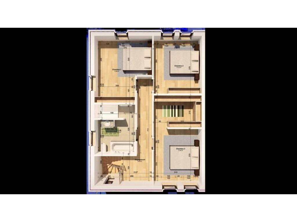 À l'étage : • Hall de nuit • 1 chambre principale avec dressing • 2 chambres • 1 salle de bain avec baignoire, douche, WC et lavabo • grenier