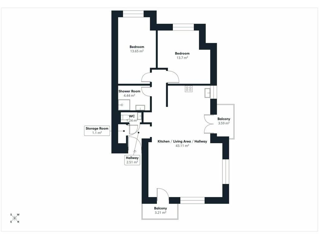 Layout: entrance hall (2.5 sqm) - storage room (1.1 sqm) - separate toilet (1.2 sqm) - spacious living area comprising an open-plan kitchen leading into the living/dining room (43.1 sqm), opening onto two balconies (3.6 + 3.2 sqm) - 2 bedrooms (13.7 + 13.6 sqm) - shower room (4.4 sqm)
