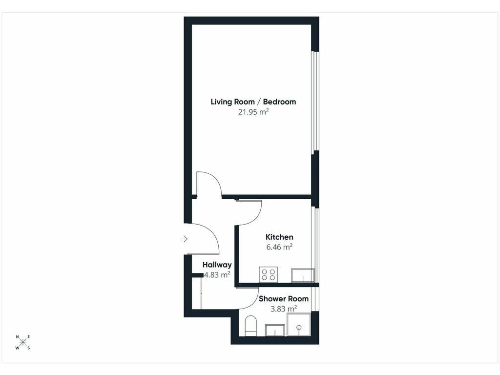 Distribution : pièce de vie/chambre (21,95 m²) - cuisine (6,46 m²) - salle de douche (3,83 m²) - hall (4,83 m²) Inclus : 1 cave (3 m²)
