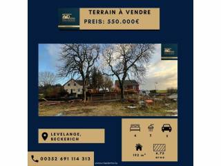 € 572.000Terreno para construção, Beckerich Localité, BeckerichNEW IMMO, a sua agência imobiliária no Luxemburgo-Belair, coloca à venda um terreno para construção na urbanização "SCHONK" no município de BECKERICH. Para mais informações, contacte o seu agente imobiliário: Cyrille KREMER no número 691 400 478 ou por e-mail: cyrille.kremer@newimmo.lu Este terreno de 7,15 hectares é ideal para a construção de uma casa nos quatro lados, num ambiente calmo e agradável, rodeado de campos e bosques. Este terreno é vendido sem contrato de construção. Sale Details - Taxas de agência à custa de: Não comunicadas - Surface du terrain: 7.15 ares Reference agence: E3