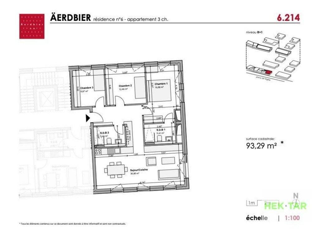 Le lot 6.214 se situe au1er étage. Cet appartement offre une superficie de 93,29m2 répartis comme tel : une entrée avec espace rangement, un séjour avec cuisine ouverte de 30,90m2, 1 salle de douche avec wc de 5,56m2, 1 chambre de 9,97m2, 1 chambre de 12,46m2 et 1 chambre de 15,88m2 avec sa salle de douche et wc de 5,41m2.