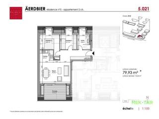 Le lot 5.021 se situe au 2eme étage. Cet appartement offre une superficie de 79,93m2 répartis comme tel : une entrée avec espace rangement, un séjour avec cuisine ouverte de 29,50m2 donnant sur une terrasse de 13,24m2 orientée plein Sud, une salle de douche avec wc de 9,84m2, 1 chambre de 12,11m2, 1 chambre de 15,81m2.