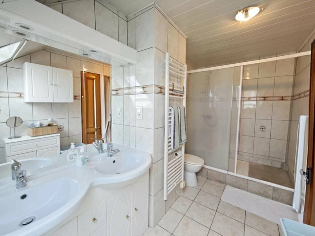 A l'étage : - 3 chambres spacieuses avec rangements (12, 11 et 10m²) - Une salle de douche avec double vasque et toilette (10m²). - Un espace de rangement.