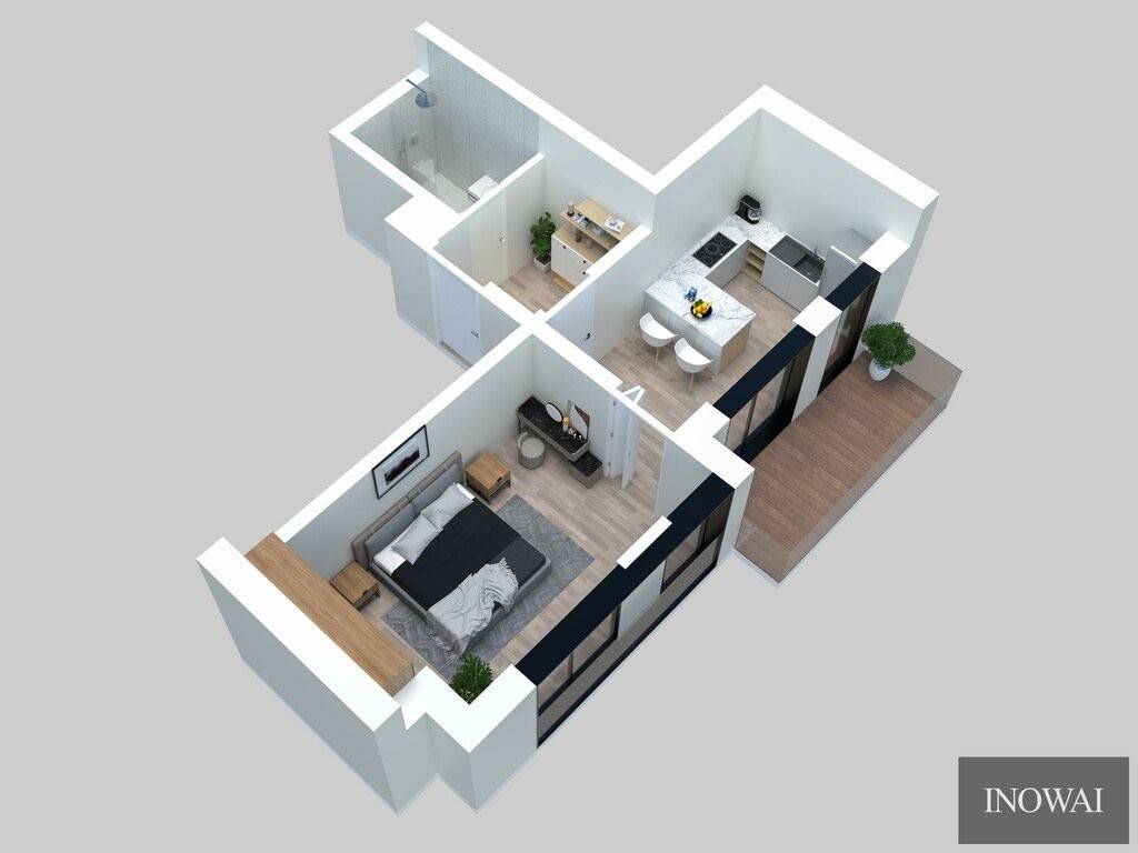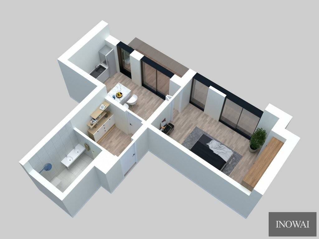 Ce studio (35.33 m²) s'ouvre sur une une entrée desservant l'ensemble de l'espace de vie. Une salle de douche avec WC complète cet espace.