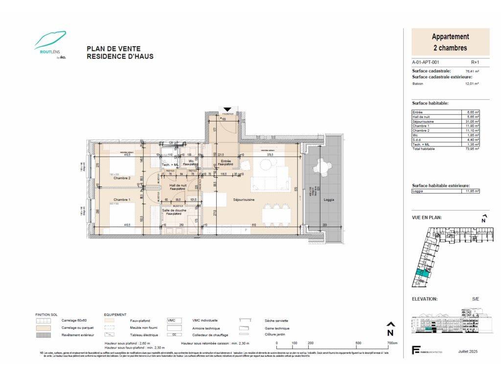 Au sein de la résidence D'Haus, IKO REAL ESTATE vous propose cet appartement 2 chambres neuf de 76,41 m² situé au premier étage, comprenant un séjour/cuisine, une salle de douche avec wc séparé, une loggia de 12,01 m² et une cave privative.