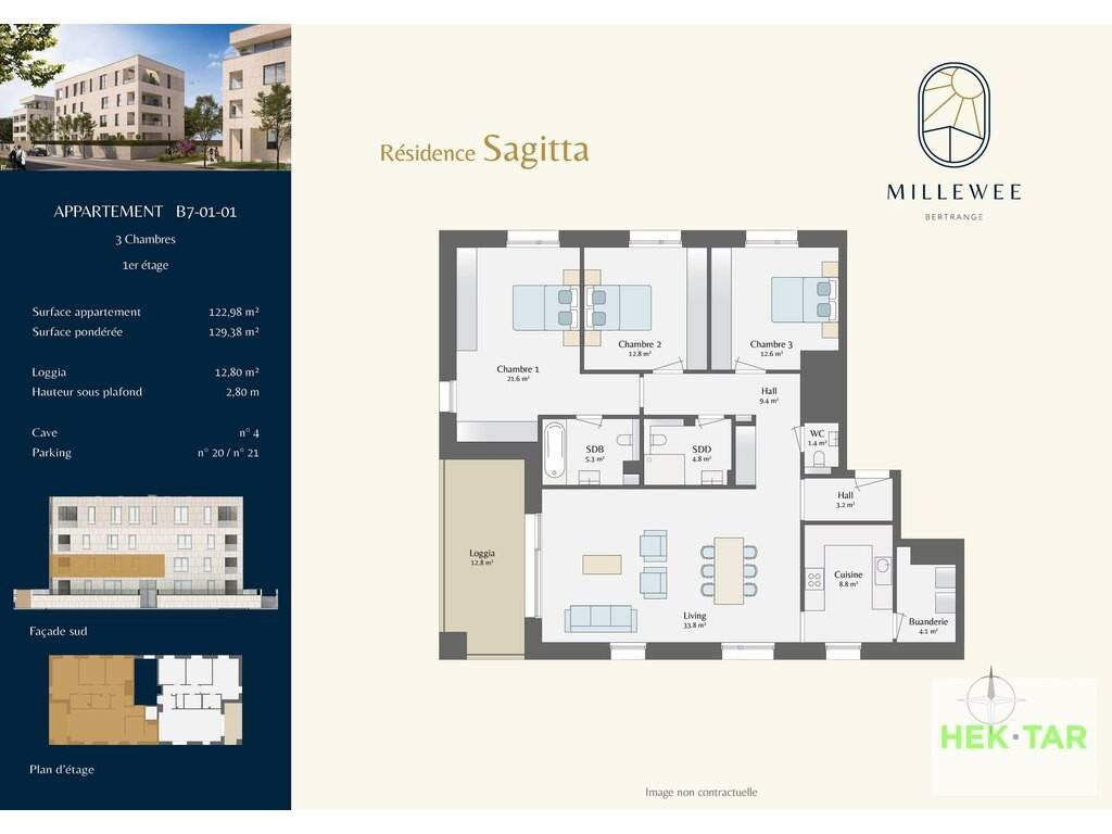 L'appartement B7_01_01 d'une surface habitable d'environ 122,98m2 situé au 1er étage offre une spacieuse entrée avec un WC séparé, menant à un lumineux séjour agrémenté d'une magnifique terrasse de 12,80m2, d'une cuisine et d'une buanderie.