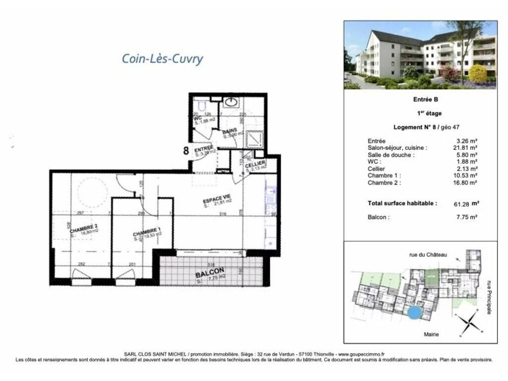 N’hésitez pas et venez découvrir ce nouveau programme neuf en plein cœur du village de Coin-Les-Cuvry. Idéalement situé sur l'Axe Luxembourg - Nancy, ce village bénéficie d'une facilité d'accès aux principaux axes routiers, d'une proximité avec l'aéroport régional et la gare "Lorraine TGV". Le récent développement de zones commerciales comme le Waves à Augny ou encore l'arrivée du géant Amazon à 5 min de la résidence rendent ce projet très attractif.
