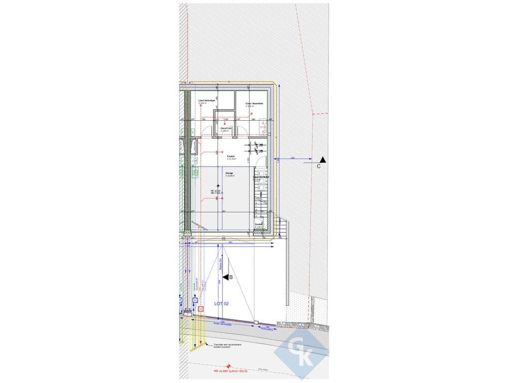 Au RDCH : garage pour 2 voitures (25,09 m²) ; couloir (12,79 m²) ; cave/buanderie (9,06 m²) ; cave à vin (3,00 m²) ; local technique (9,00 m²) ; local poubelles (1,21 m²) ; 2 parkings extérieurs.