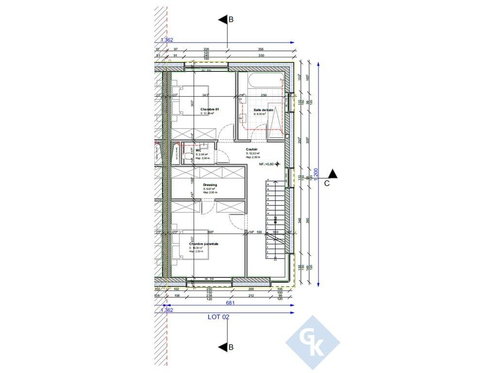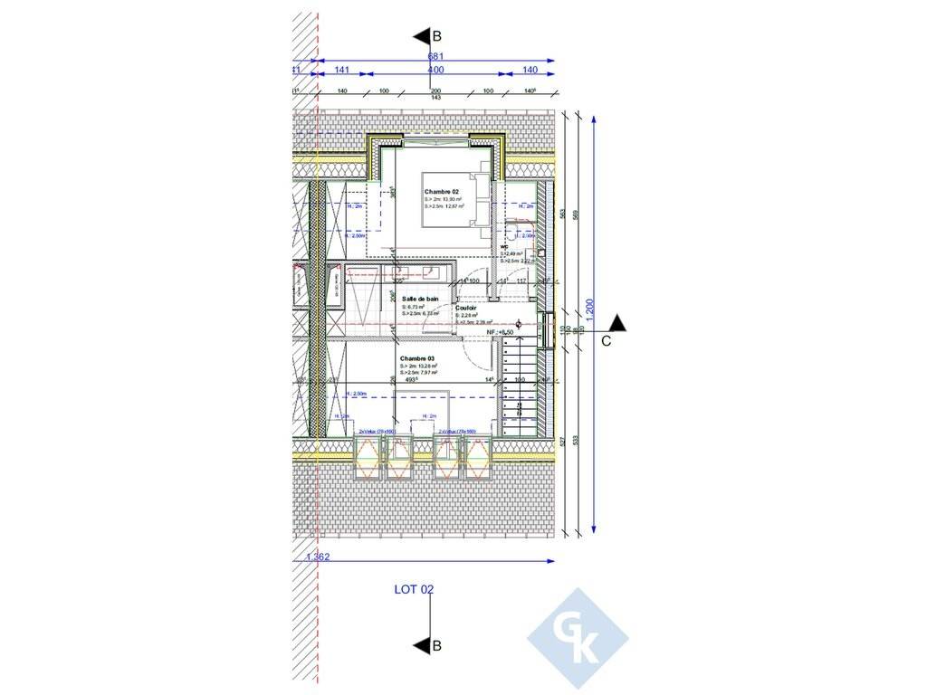 2ième étage : hall de nuit (12,22 m²) ; salle de bain (9,09 m²) ; chambre 1 (12,49 m²) ; WC séparé (2,04 m²) ; chambre 2 (16,00 m²) avec dressing (6,67m²).