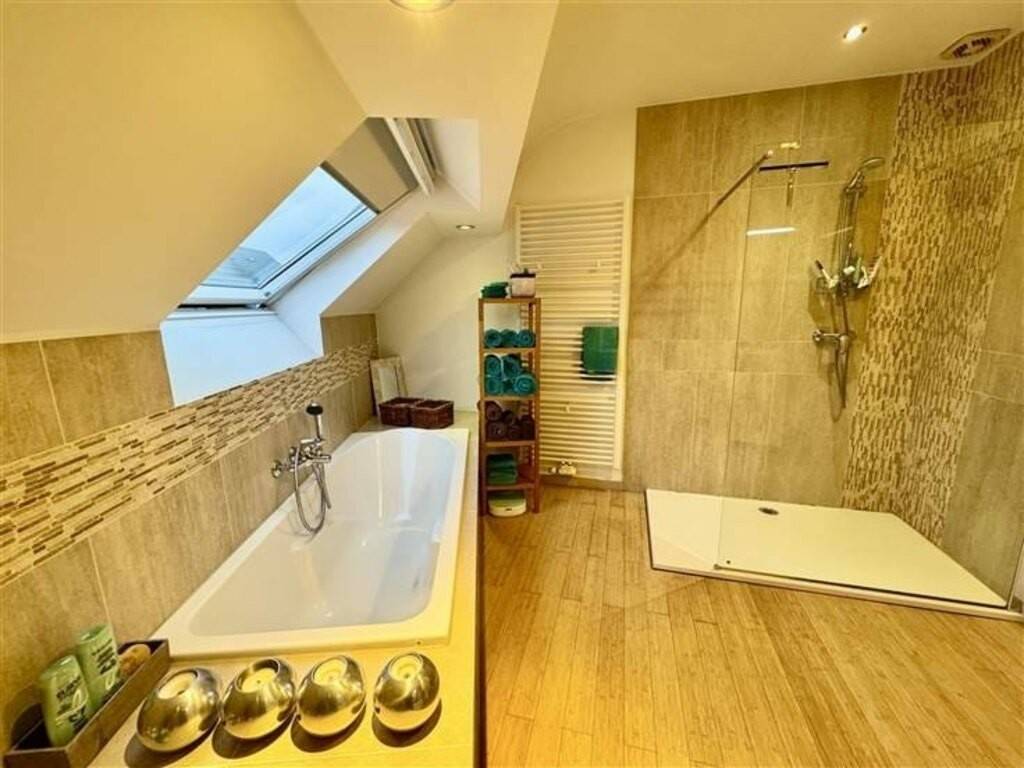 Les extérieurs offrent un terrain de près de 15 ares, terrasse, jardin, chalet équipé, grand garage (± 40 m²) et nombreux parkings.