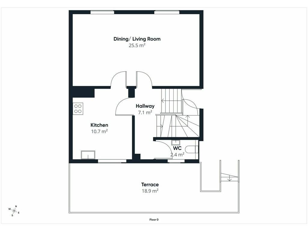 Ground floor: entrance hall (7m²) - living/dining room (25.5m²) - kitchen (10.7m²) - separate toilet (2.4m²)