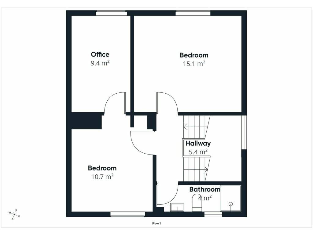 First floor: hall (5.4m²) - 2 bedrooms, one of which is a double that can be used as an office (15.1m² + 20.1m²) - shower room (4m²)
