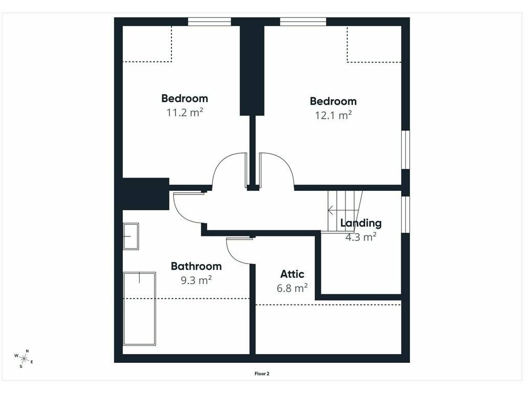 Second floor: 2 bedrooms (11.2m² + 12.1m²) - bathroom (9.3m²) - attic (6.8m²)